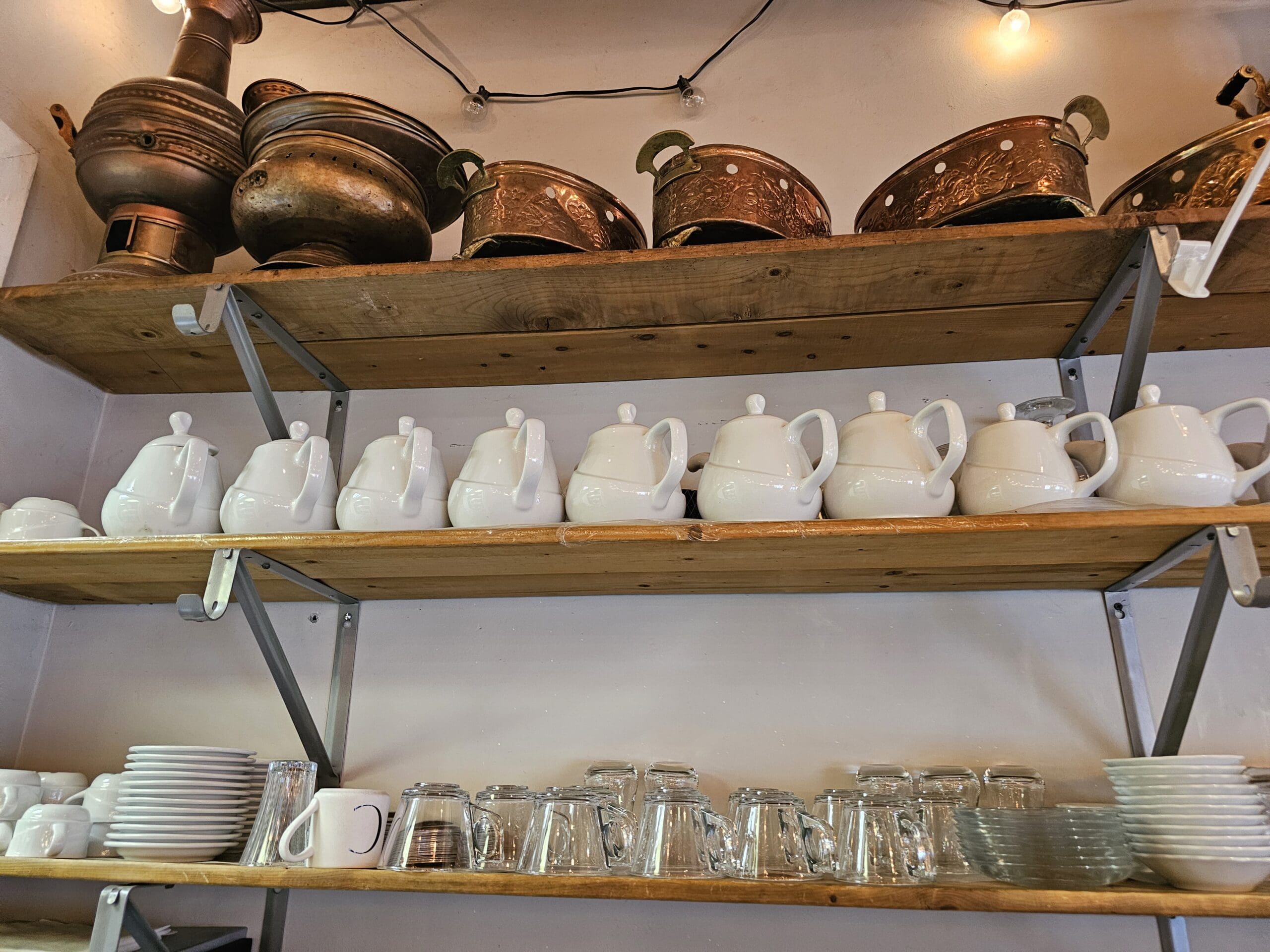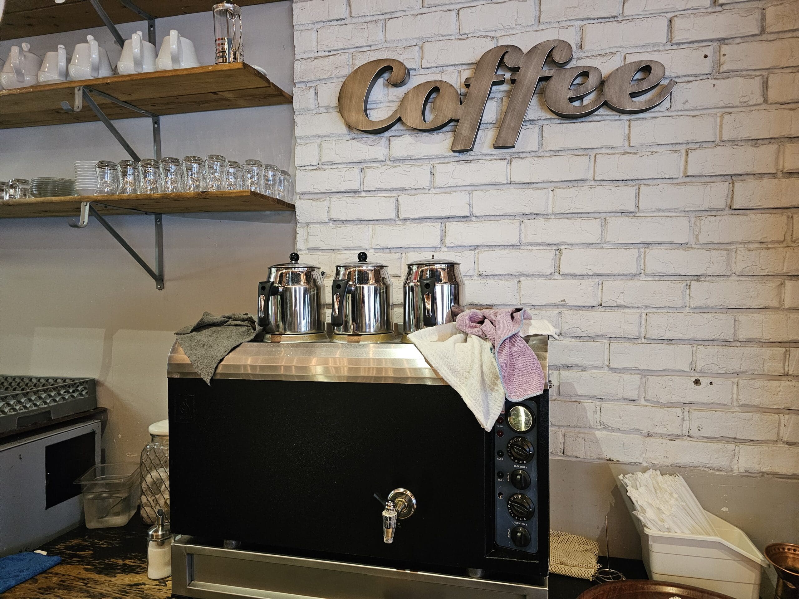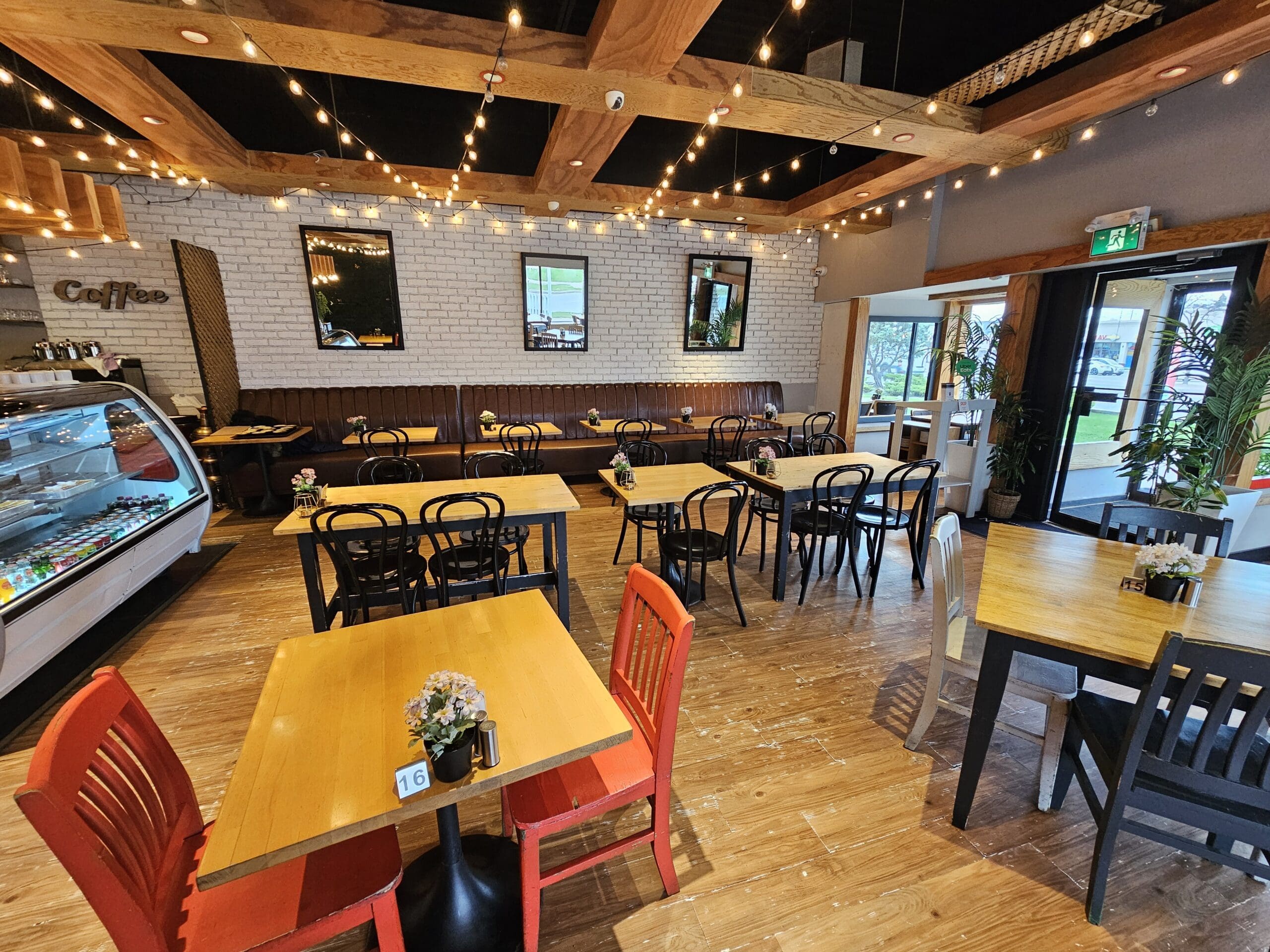 The restaurant has a lovely dining area and a service and café bar with desserts on display. It has an espresso machine and lots of equipment behind the bar.