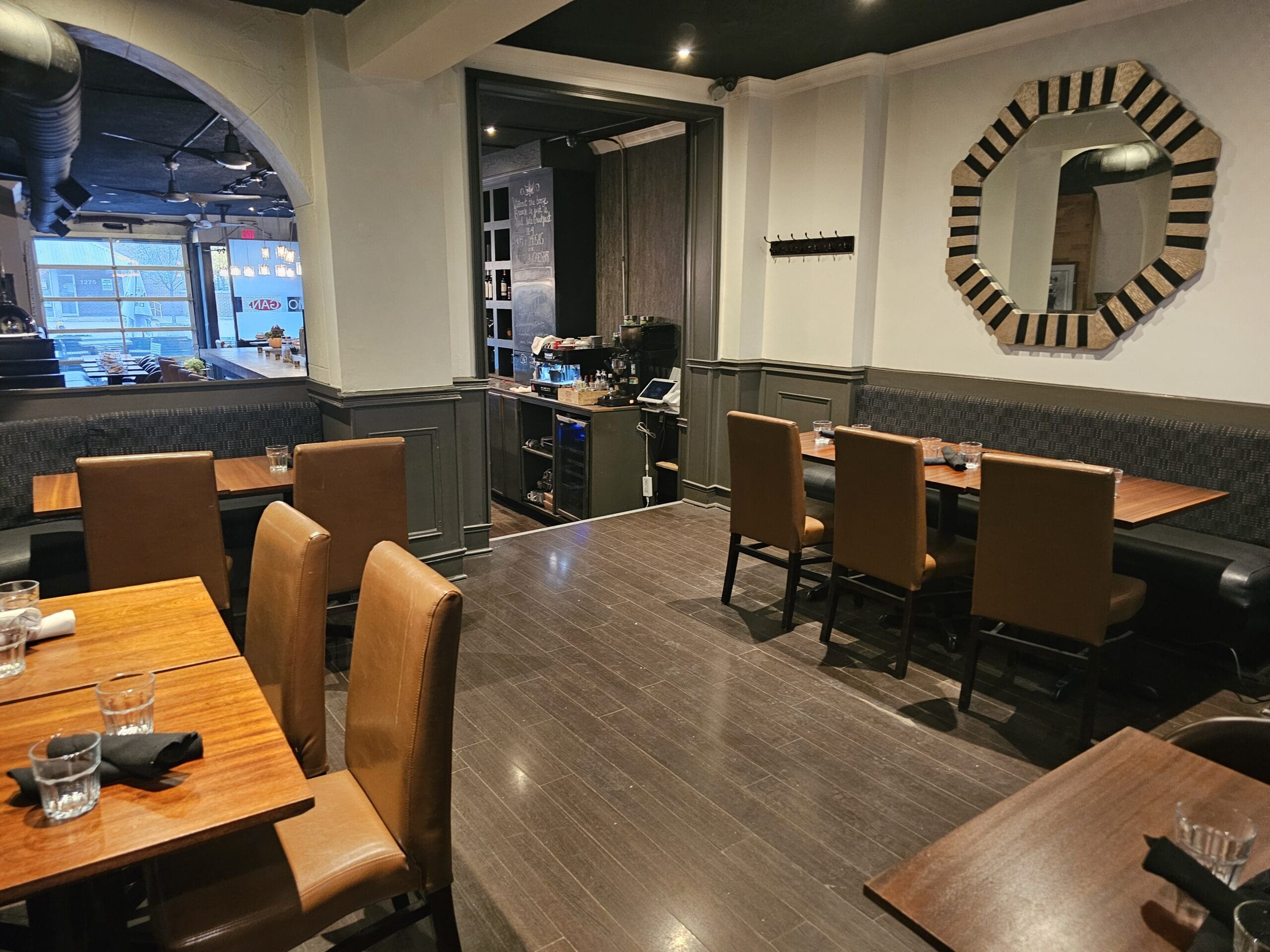 The restaurant spans 1,200 sq ft and features a full commercial kitchen equipped with a 9-ft commercial hood and a large walk-in fridge. The layout includes a solid bar and an additional seating area at the back, ideal for private parties or events.