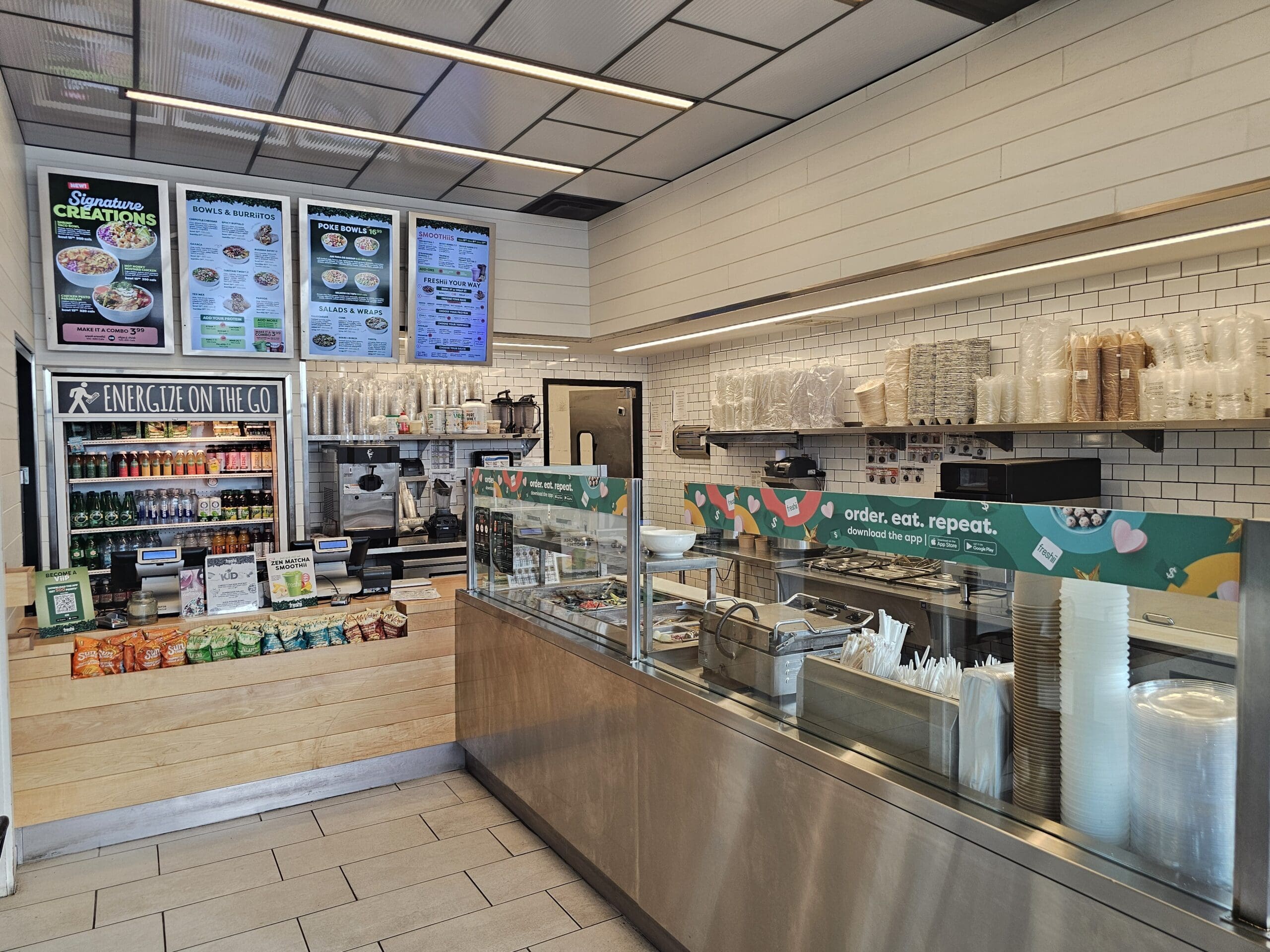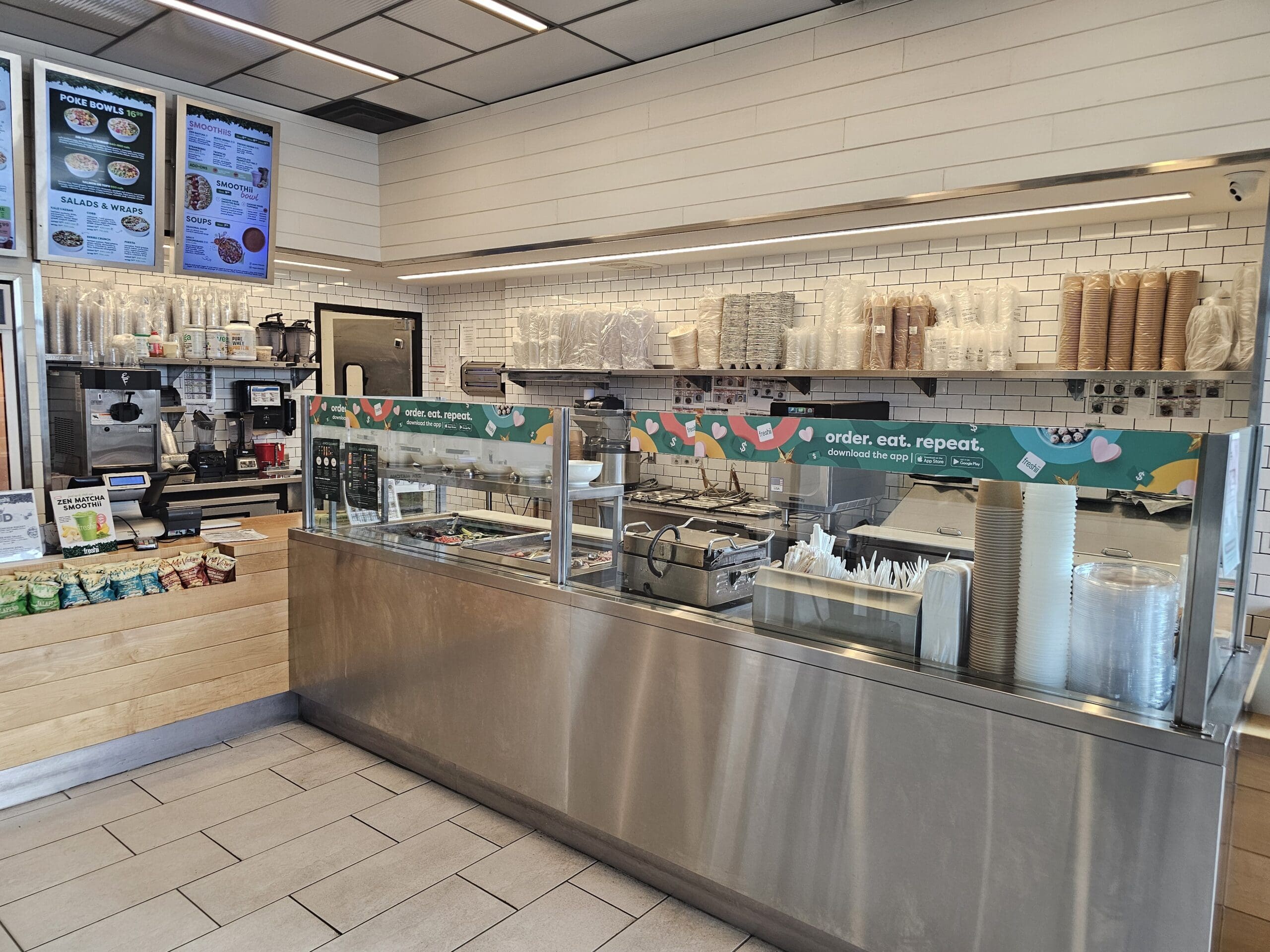 The restaurant features a modern 1,037 sq ft layout that is perfectly designed for a quick service restaurant (QSR). With seating for 12 guests, it offers an efficient and easy-to-manage setup ideal for both experienced operators and first-time buyers. The space is bright, welcoming, and aligned with Freshii’s clean and modern brand image.