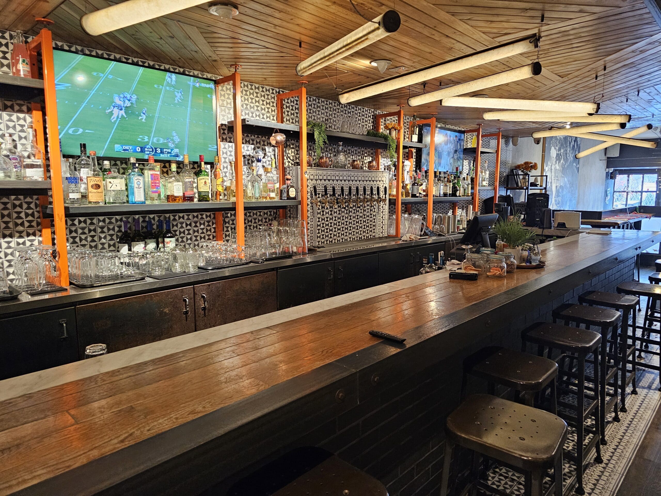 The interior layout is ideal for high-volume service, featuring a welcoming cocktail bar at the front and ample dining space throughout. The chef’s kitchen is fully equipped with a 12-ft commercial hood and two walk-in fridges, providing all the infrastructure needed for consistent and efficient operations.